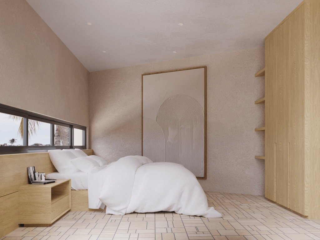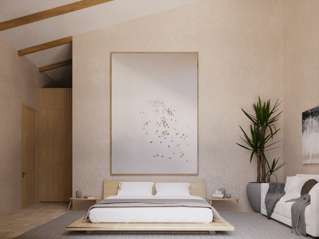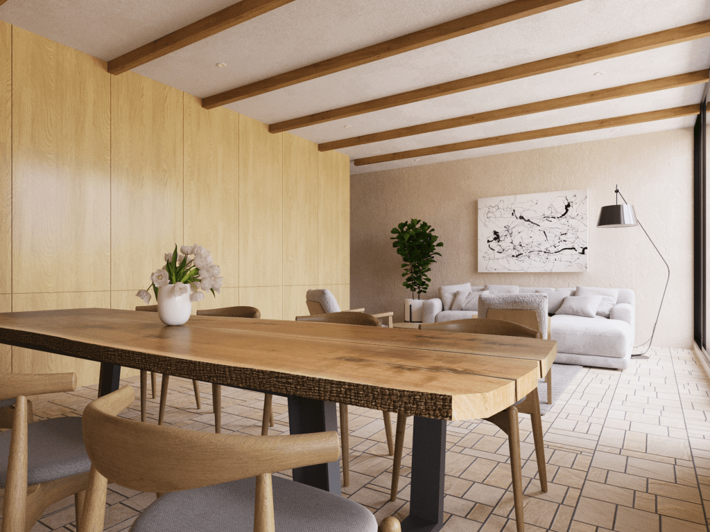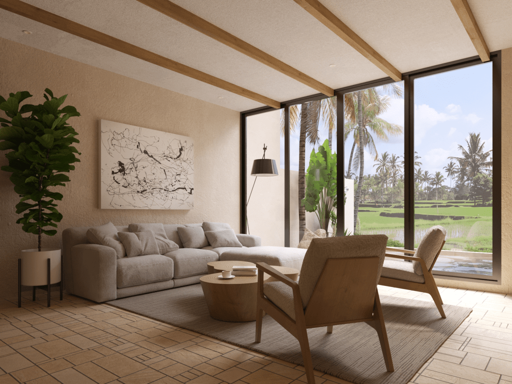 The visualization showcases the interior’s balance of natural light, neutral tones, and textural depth. Here are some key elements captured in the imagery: