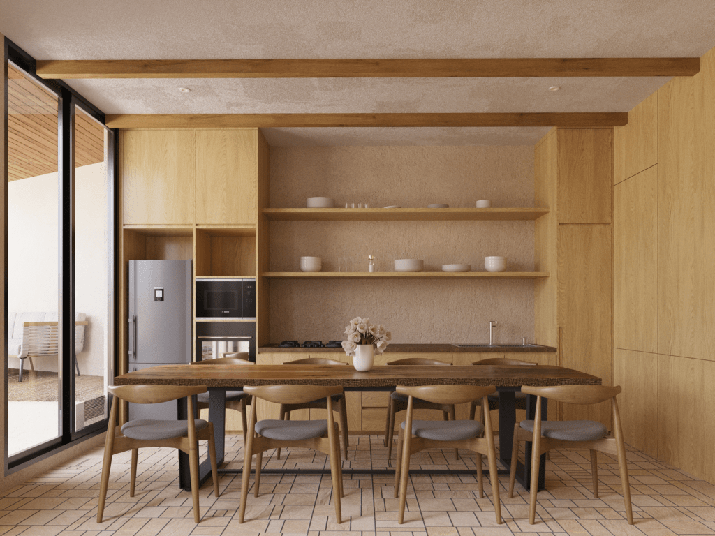 A live-edge wooden dining table serves as the centerpiece, exuding a natural and organic vibe. Surrounded by ergonomic chairs, the setup is ideal for family meals or entertaining guests.