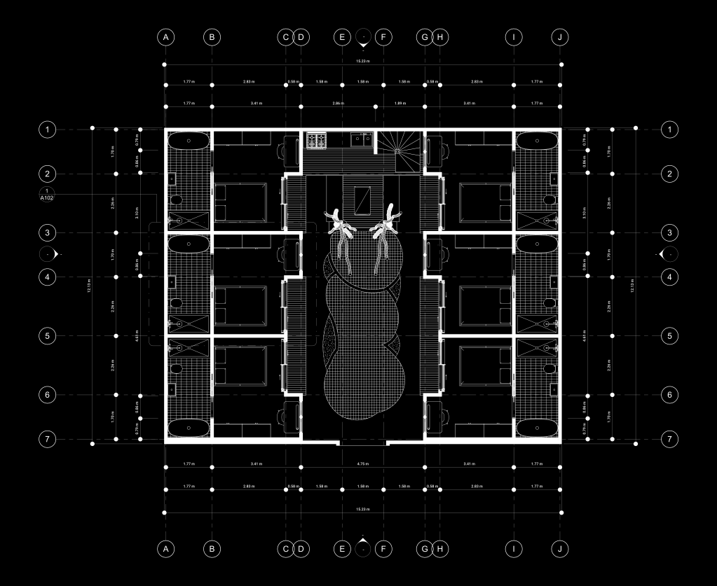 A hallmark of Maldivian villas is the seamless fusion of indoor and outdoor spaces. Open-air bathrooms, overwater decks, and shaded verandas invite guests to fully immerse themselves in the tropical experience. In this villa, the circular pool and lush landscaping are a focal point, creating an inviting central hub that ties together all the surrounding spaces.