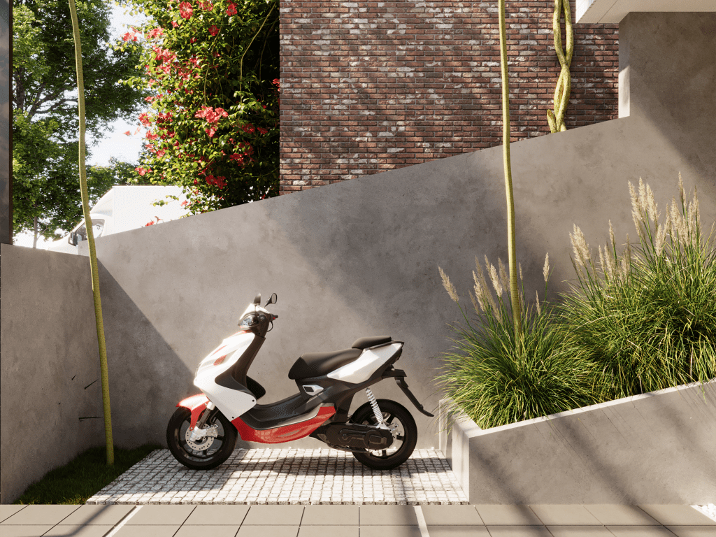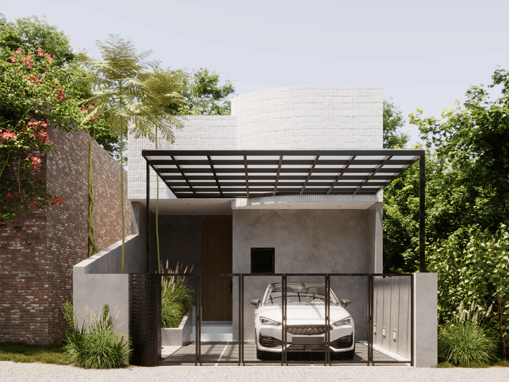 True to its minimalist roots, the house avoids unnecessary embellishments. Instead, it focuses on structural details and finishes, such as the vertical grooves on the concrete wall and the brick accents that subtly break the monotony.