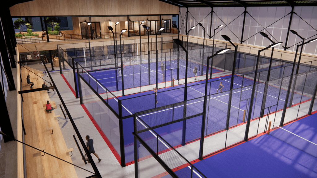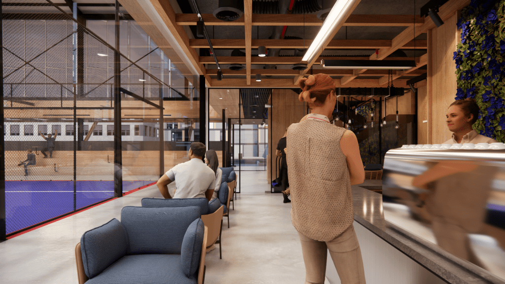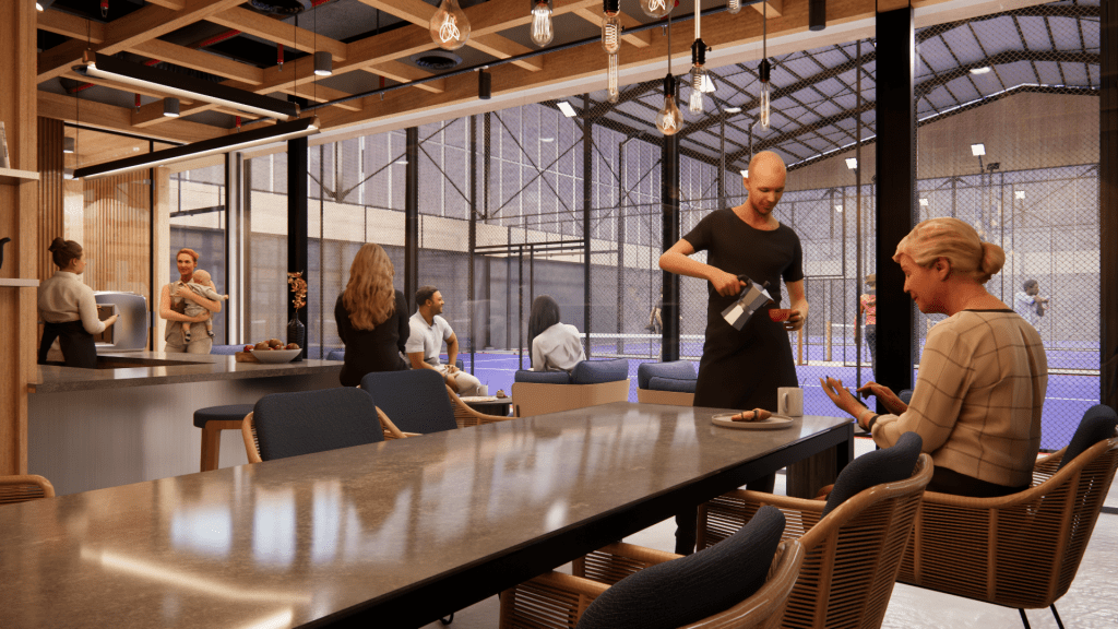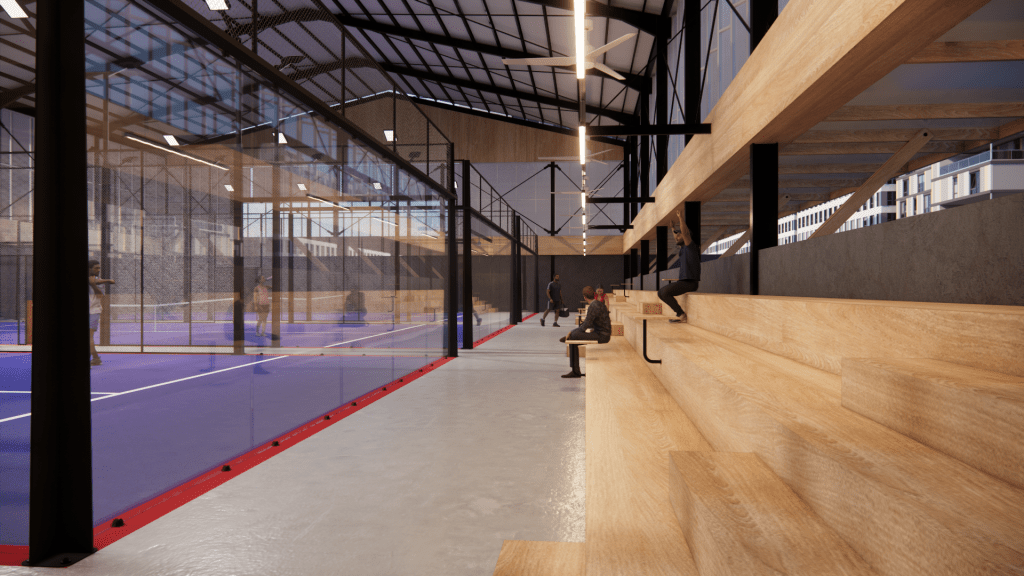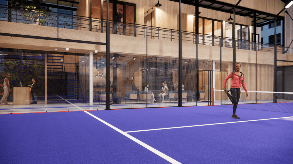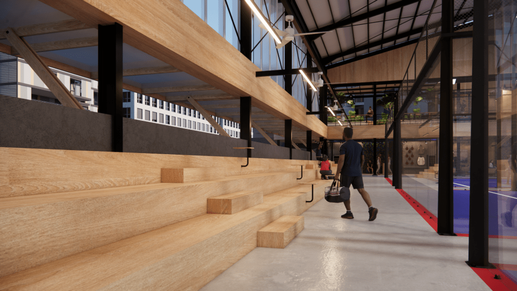 - Large transparent glass openings blur the boundaries between café, mezzanine, and courts—inviting spectators into the energy of the match.