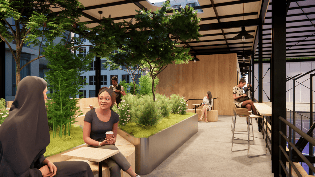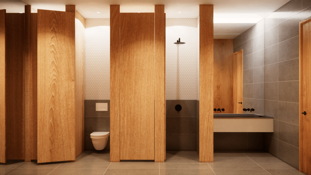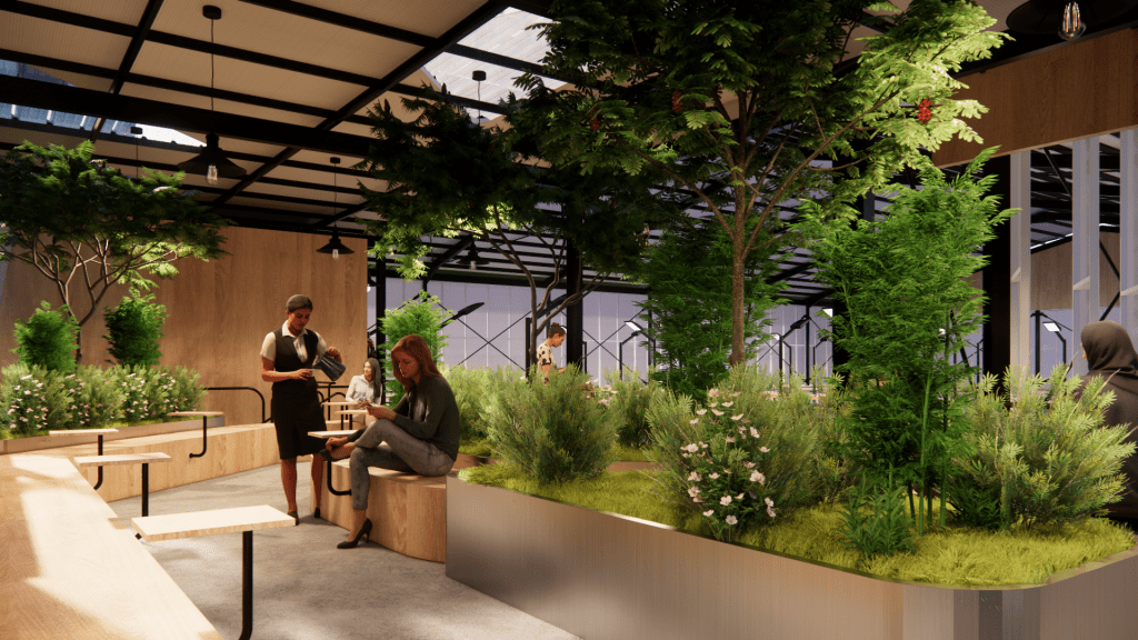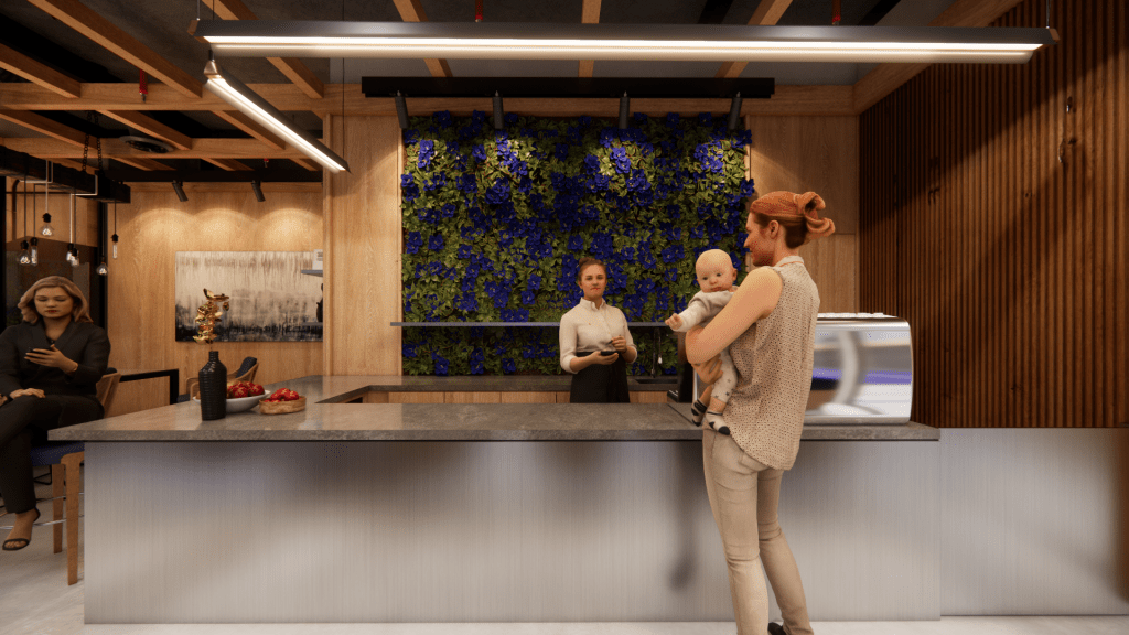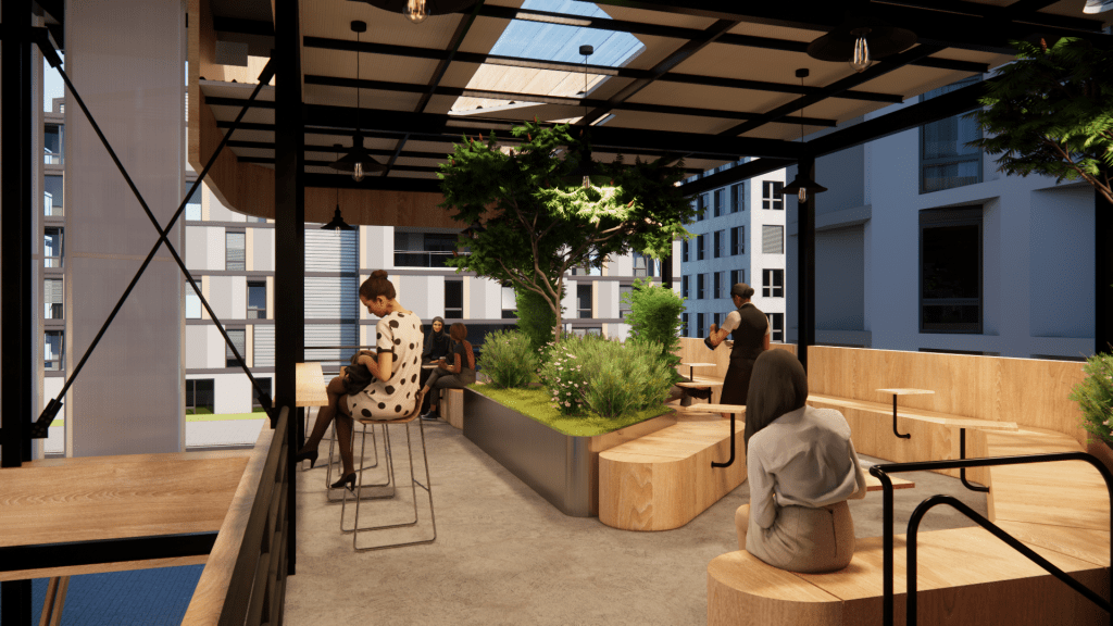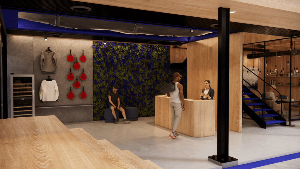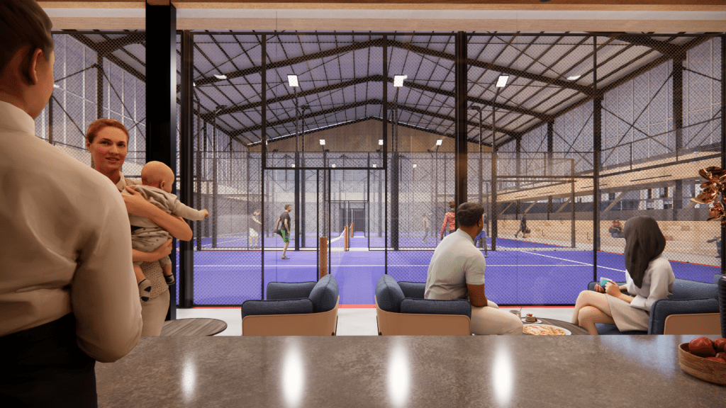 - Large transparent glass openings blur the boundaries between café, mezzanine, and courts—inviting spectators into the energy of the match.