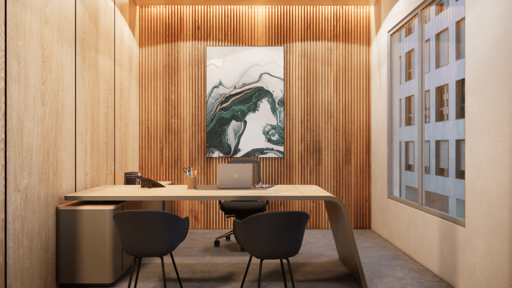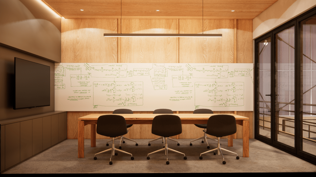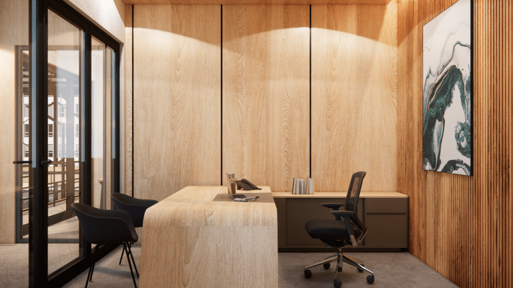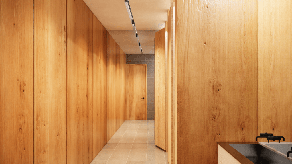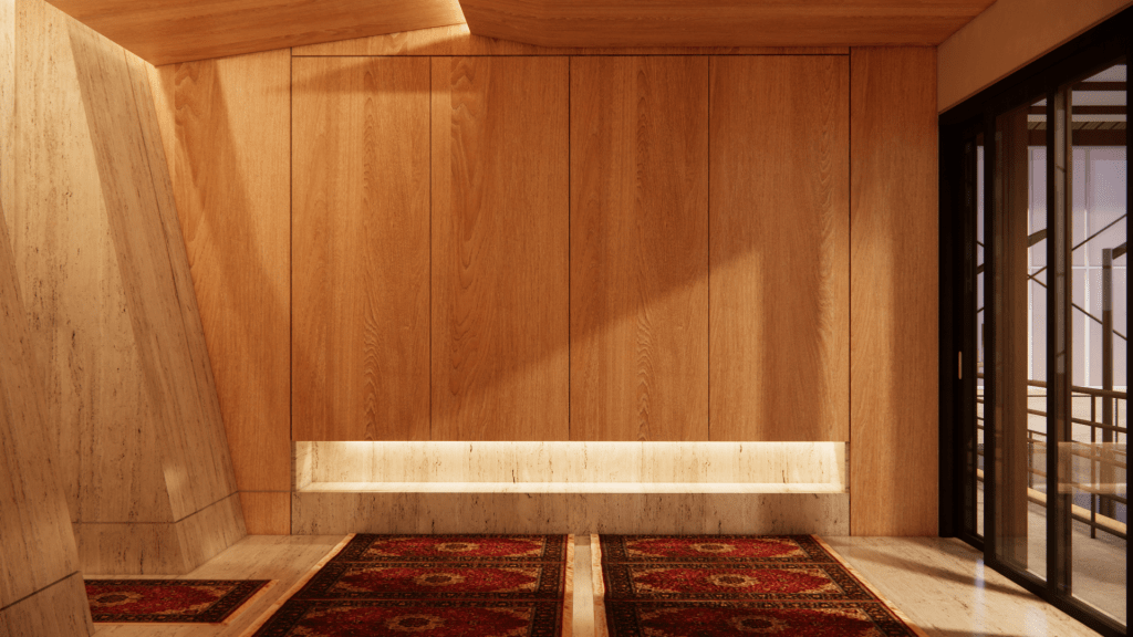 - Vertical wooden slats partition space with rhythm and warmth—seen in interior walls, ceiling details, and the façade.